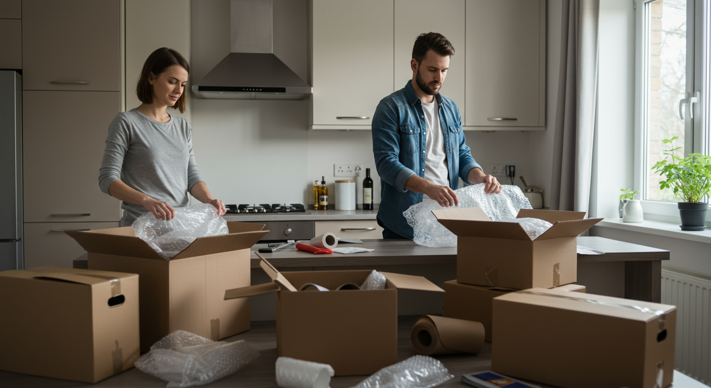 You can't ignore packing supplies and materials costs when budgeting for your move. Alt text: Man and woman using bubble wrap for packing
