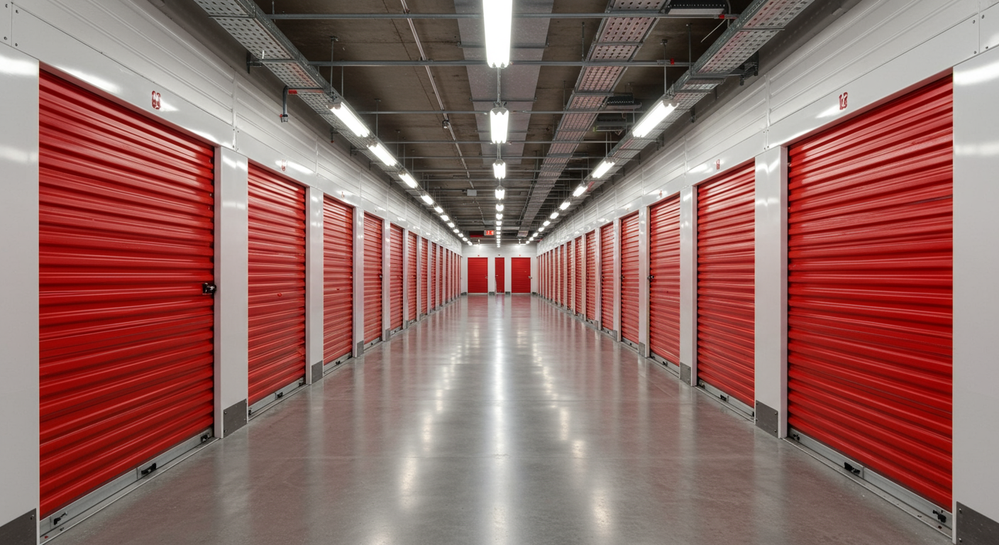 In some cases, renting storage units during the relocation is necessary, so you have to budget for that, too. Alt text: Hallway filled with red storage units