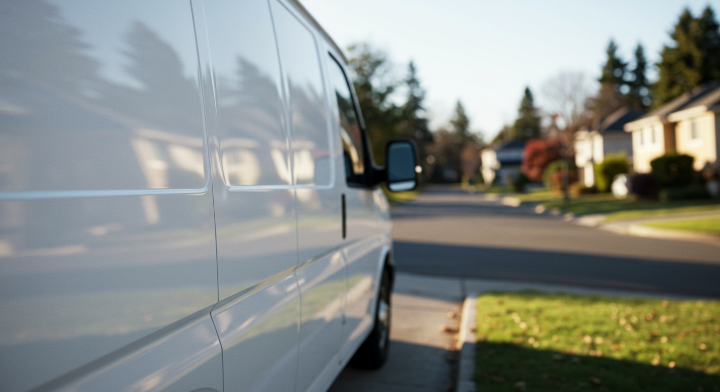 Comparing the prices of various moving companies can save you money. Alt text: A white moving company van